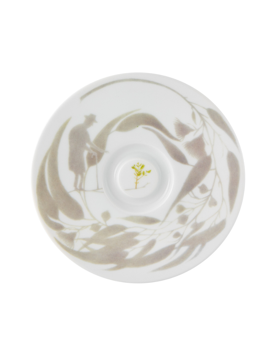 Tasse et soucoupe dans les tons vert et gris Zoom sur la tasse avec des feuilles vertes Soucoupe avec des dessins gris d'animaux Boîte dans laquelle se trouve la tasse et la soucoupe, la boîte est désigné aux couleurs de la collection bode inspiratoire
